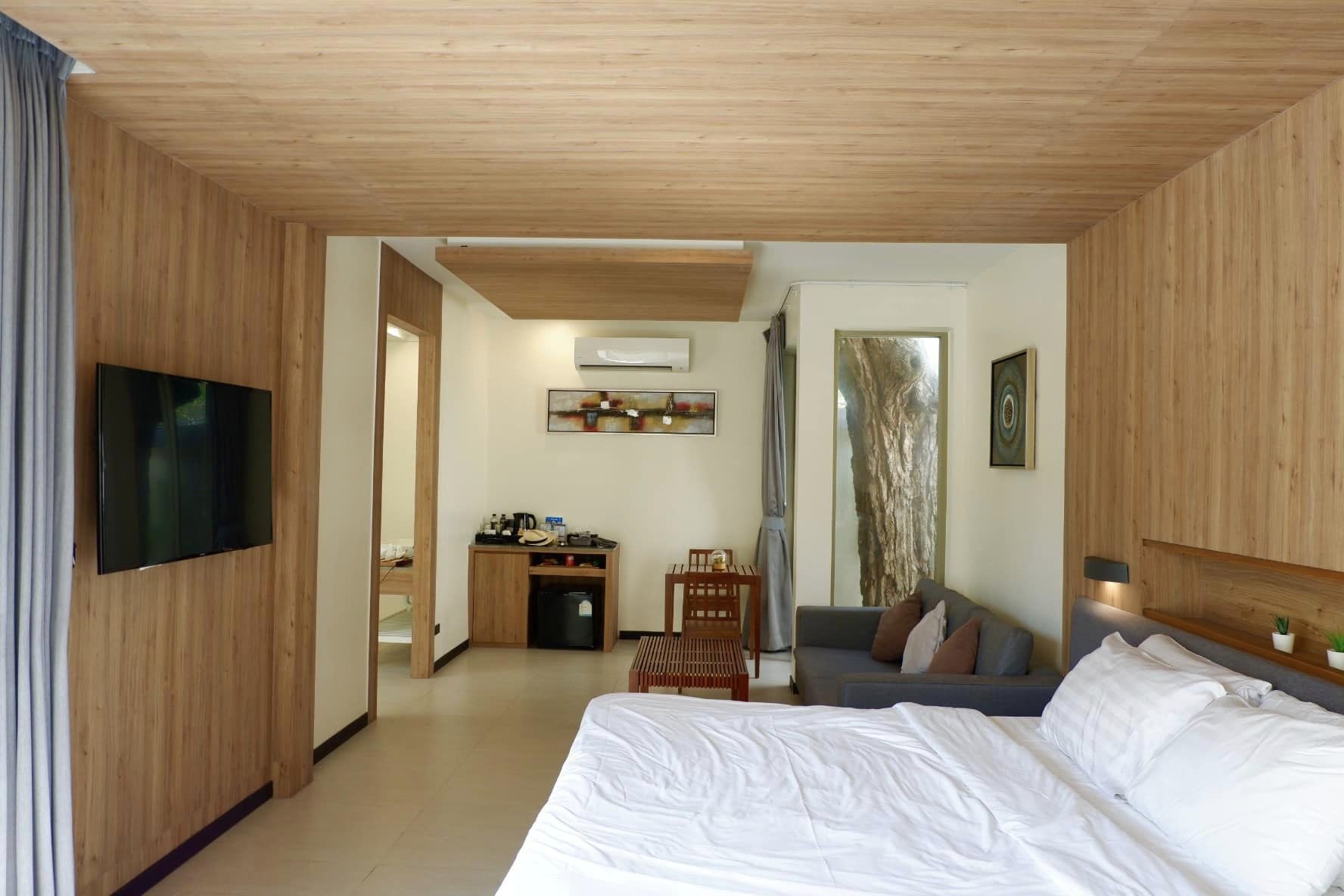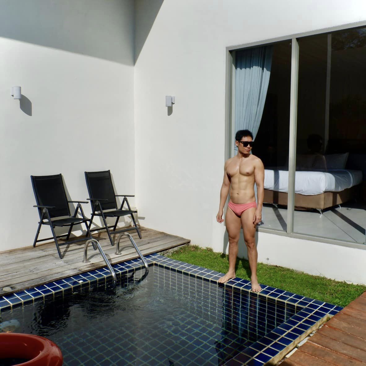 พื้นที่เยอะ มีโซนนั่งเล่น โซฟา โต๊ะทานข้าว ห้องแต่งตัวกับห้องน้ำแยกกัน มีอ่างอาบน้ำอยู่ใกล้ๆ สระด้วย วุ่นวายสายถ่ายรูปมาก ตัวสระน้ำขนาดกำลังดี กลางคืนก็เล่นได้ มีไฟสว่างรอบ ถ้าใครจะหวิวขั้นสุด ขอบอกว่า ไม่ได้ส่วนตัวขนาดนั้นนะ พุ่มไม้กั้นห้องข้างๆ ยังไม่แน่นพอ เหอๆ