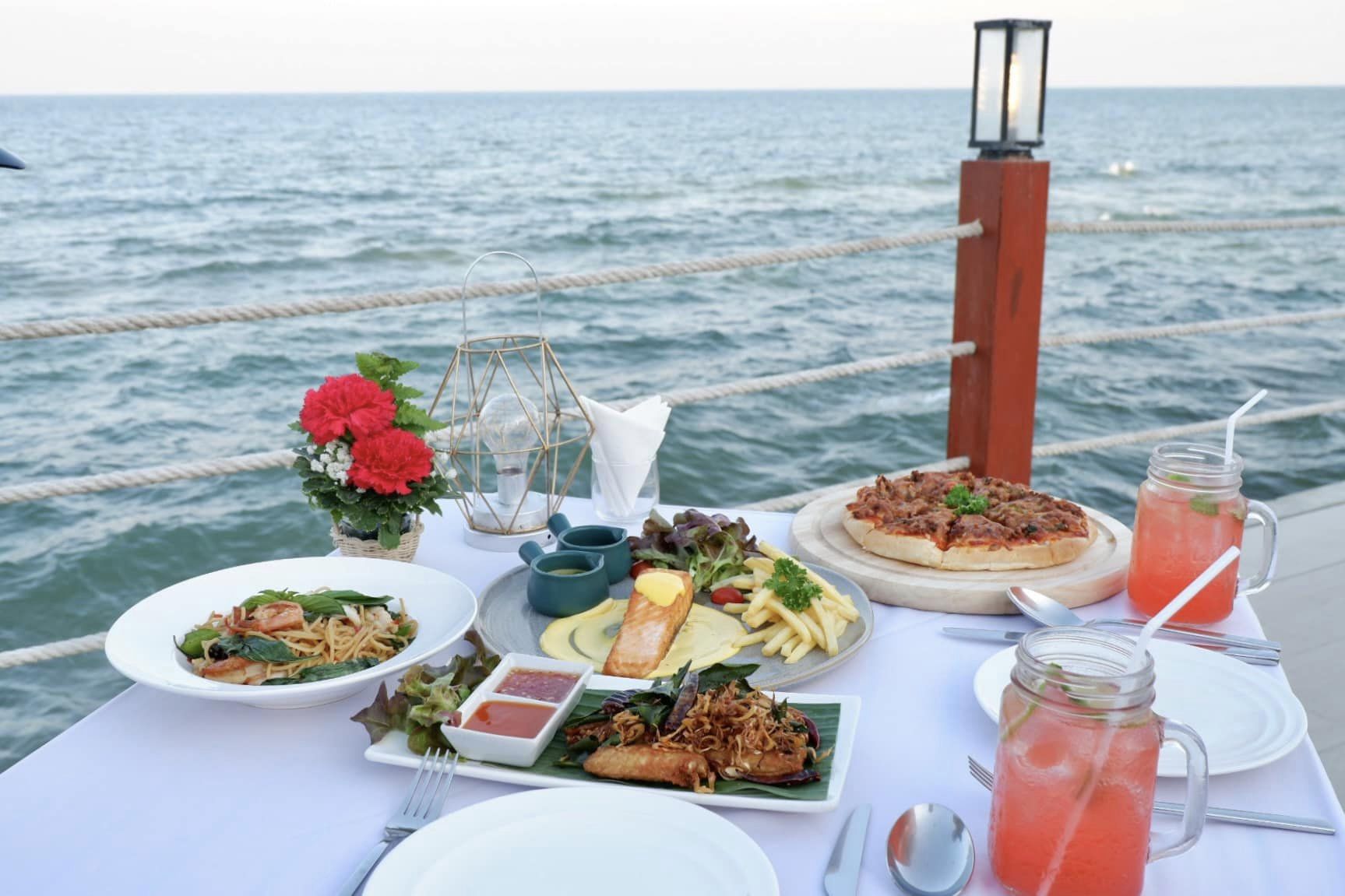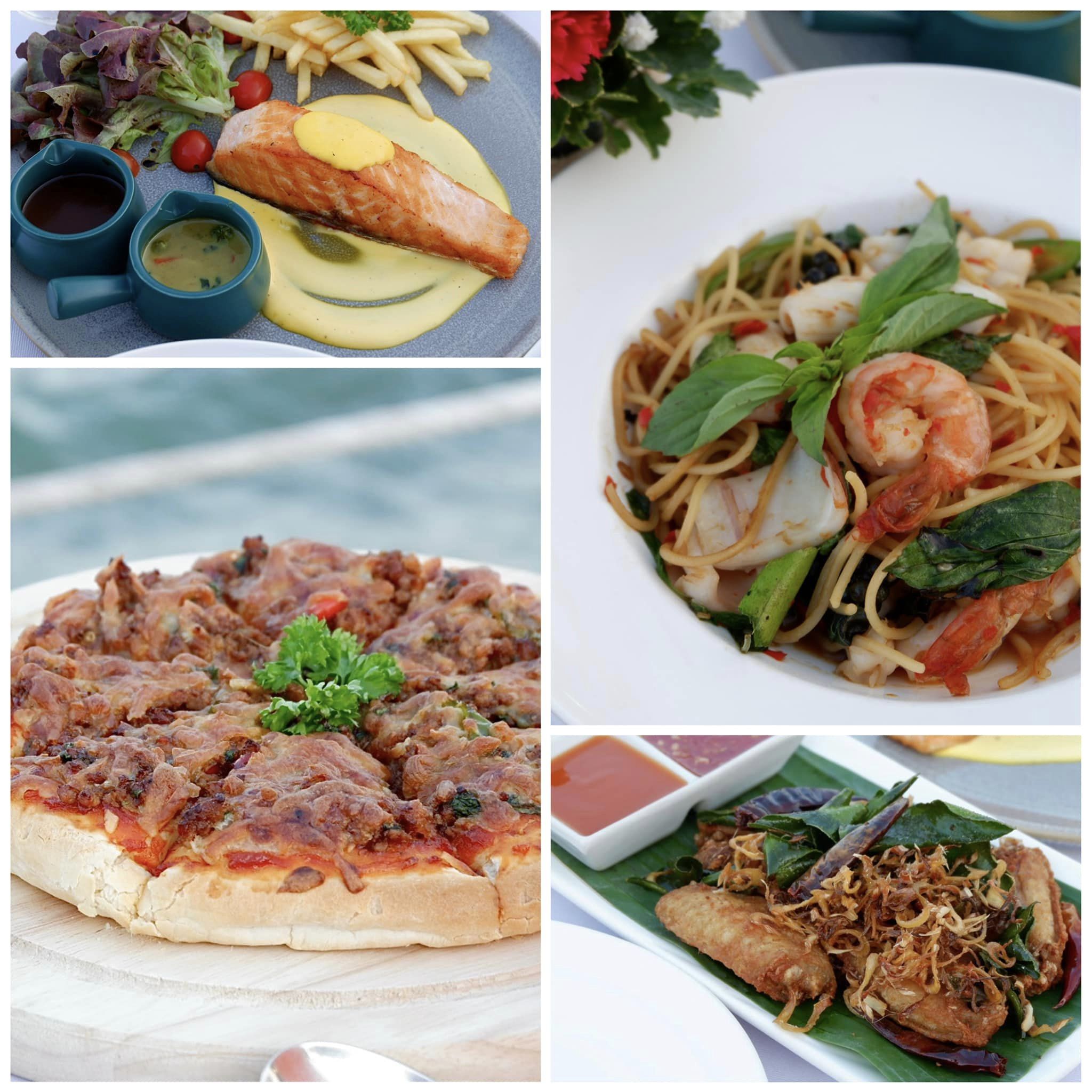 DINNER นั่งกินริมทะเลเลย น่าสนใจหลายเมนูมาก รสชาติคนไทย อร่อยมาก พิซซ่าหน้าผัดกระเพรา เลิศ