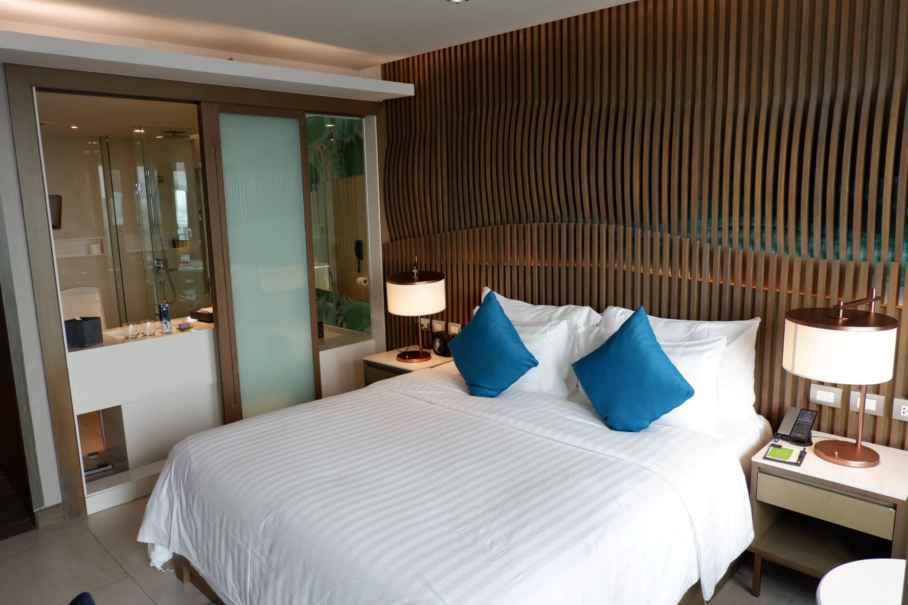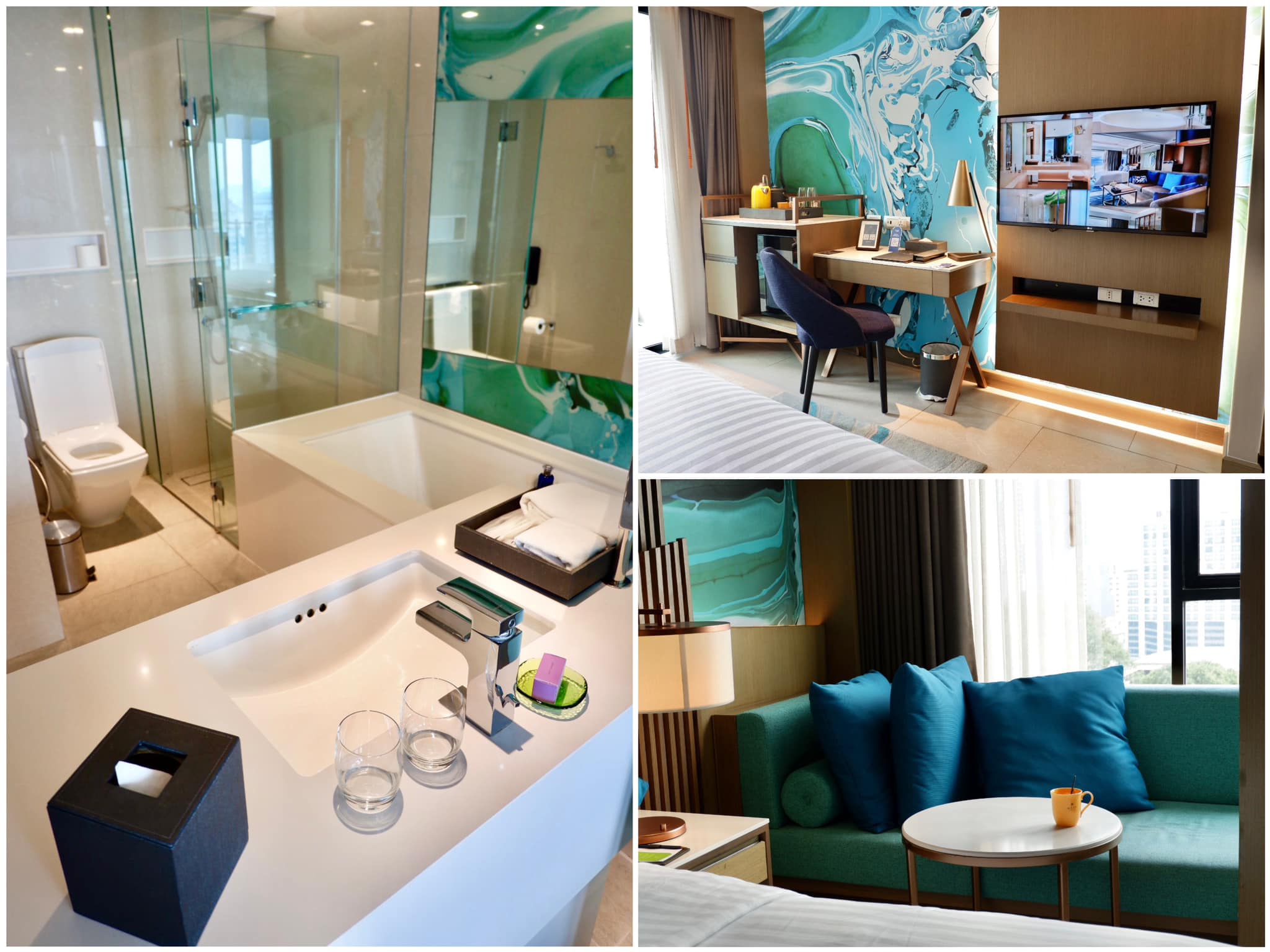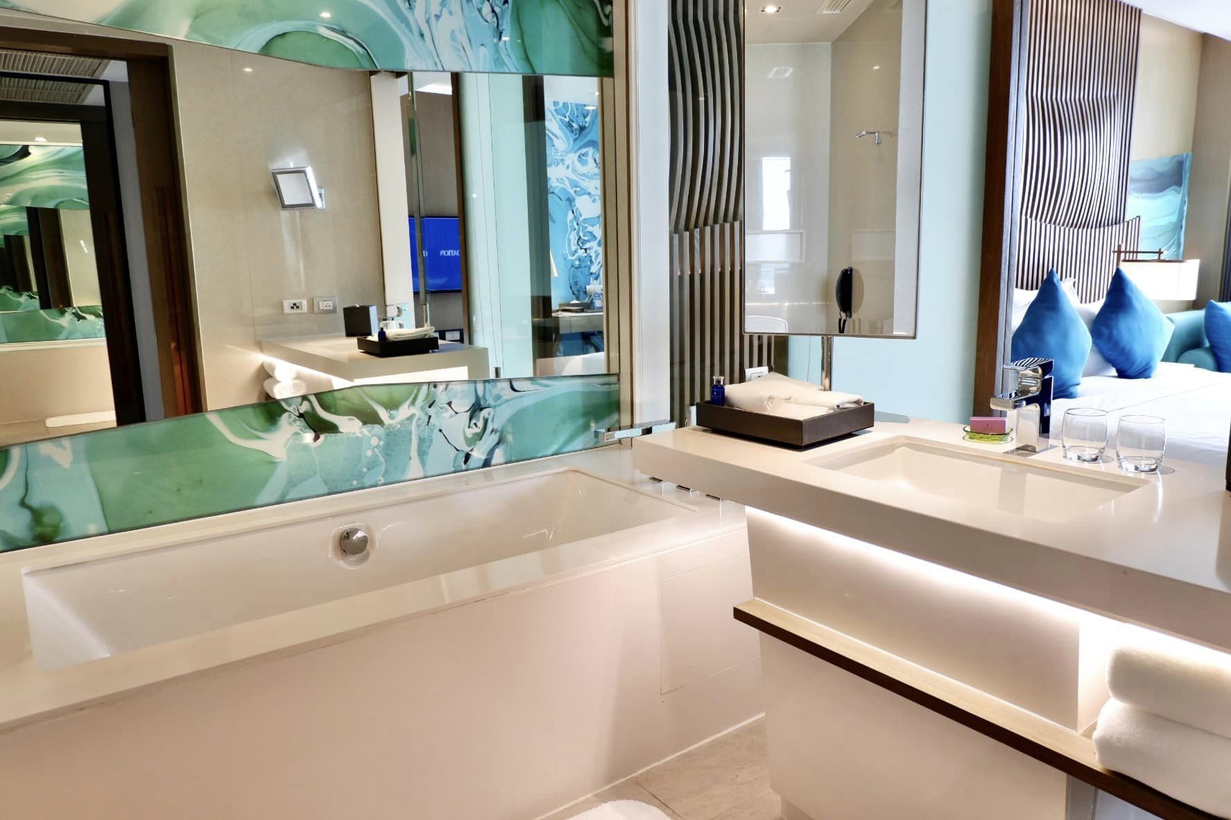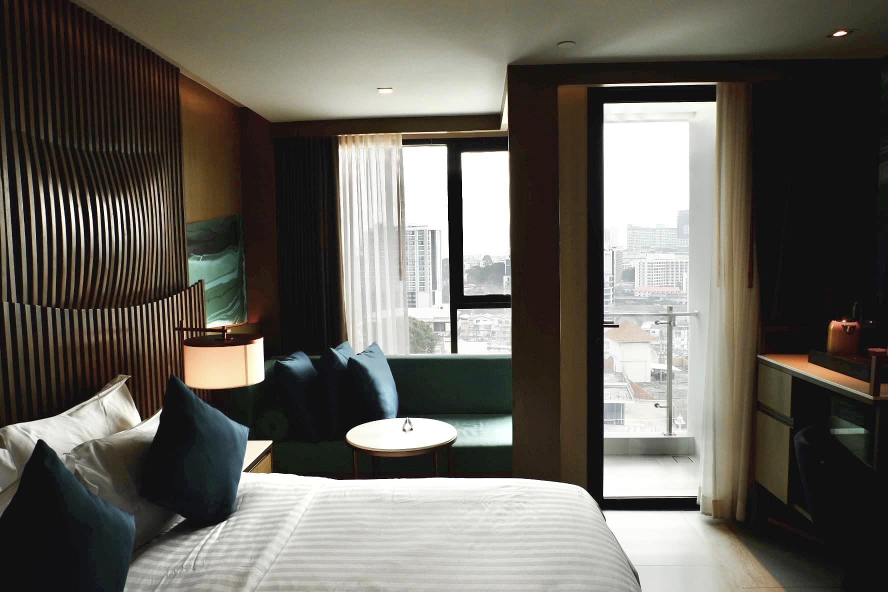 ห้องพัก PREMIER LUX ออกแบบสวย กระจกเยอะดี มีโซฟา ระเบียงเล็กๆ ห้องน้ำสวยเปิดผนังได้ พร้อมอ่างน้ำ โต๊ะทำงาน ตู้เย็น ตู้เสื้อผ้า