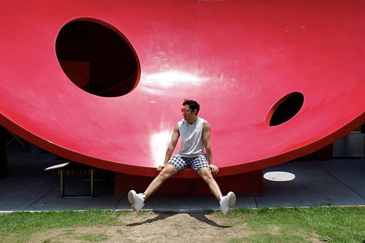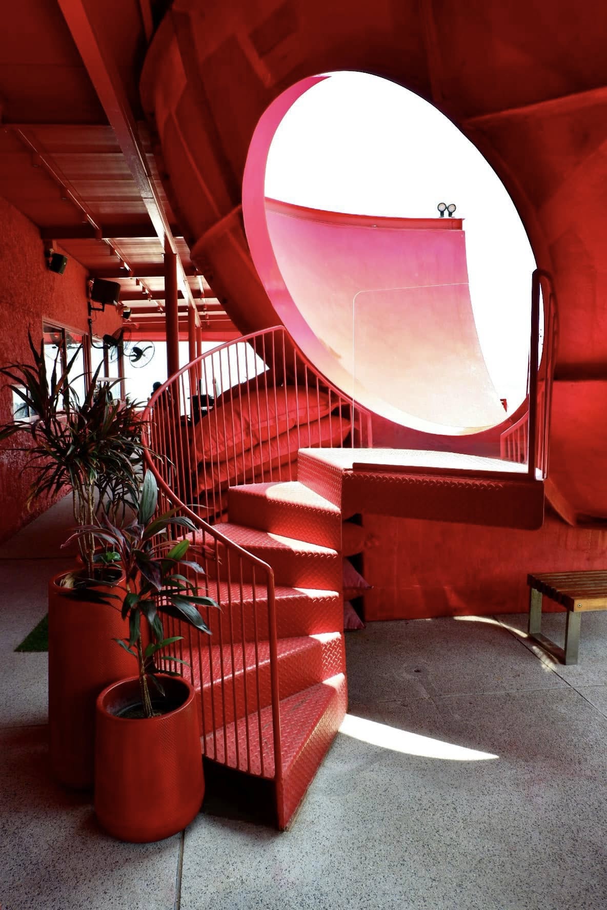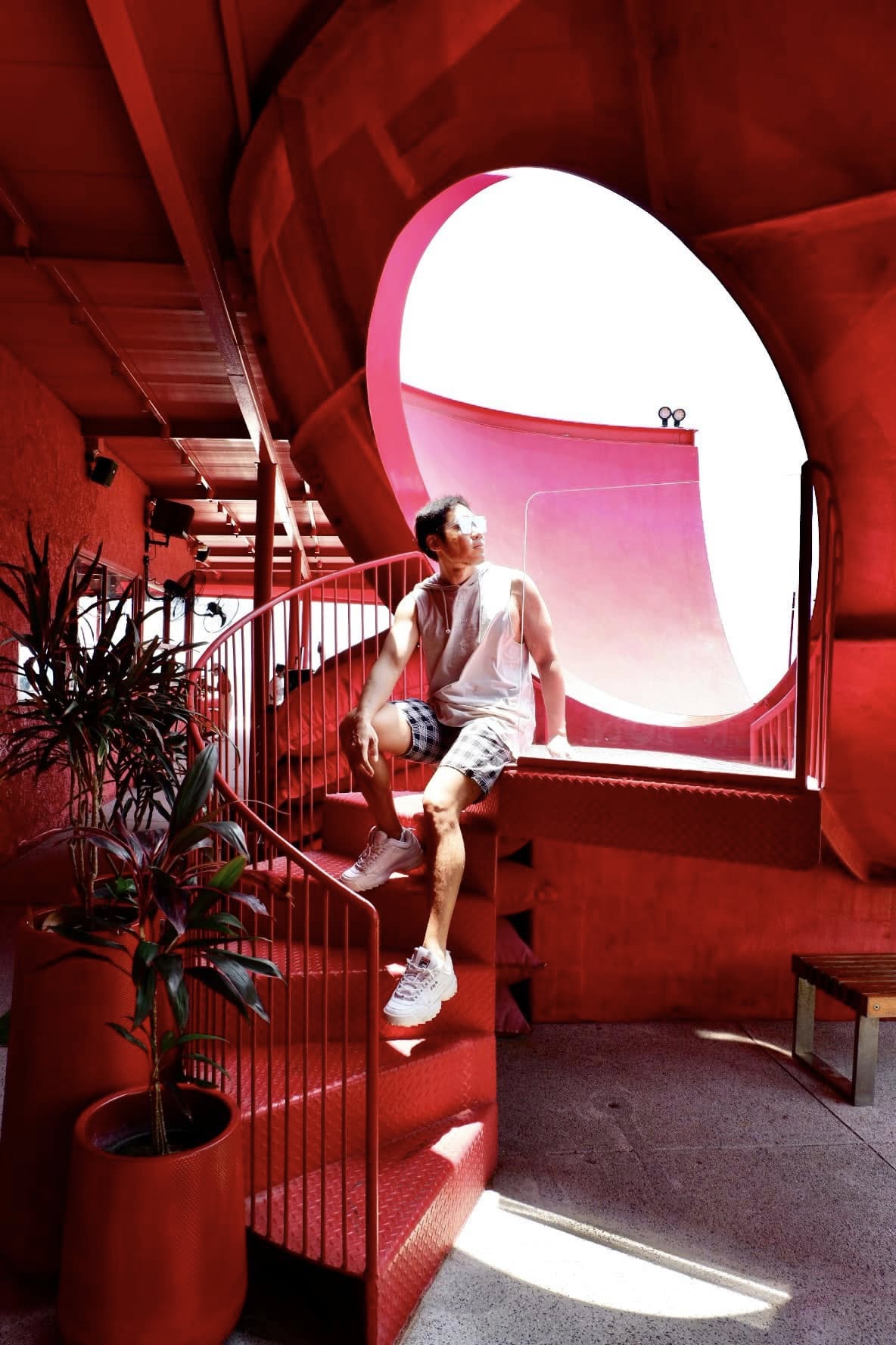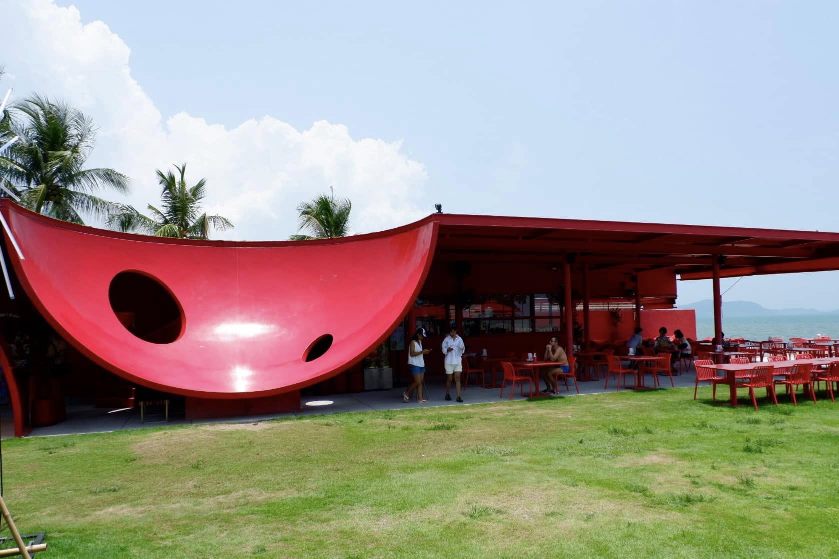 ร้านสีแดงสดสะใจ ตัดกับลานหญ้าสีเขียวสดและทะเล ออกจากร้านมา ตาแทบจะบอดสีแดง